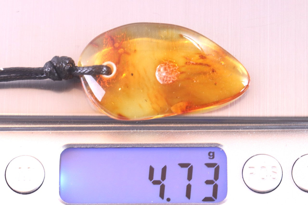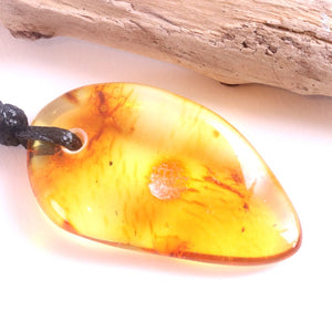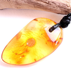 This handmade Baltic amber amulet has been shaped naturally and suspended on an eco-friendly waxed cotton cord, adjustable from 40cm to 65cm (16"–25"). Its flat shape rests comfortably against the chest, radiating a gentle warmth that is both comforting and grounding.