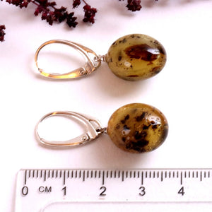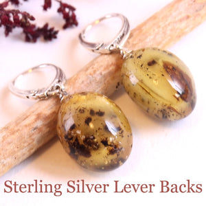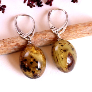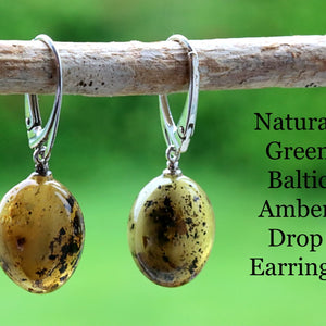 These elegant drop earrings feature rare natural green hued Baltic amber gemstones, suspended from solid sterling silver hooks. The rich olive-to-deep green tones shimmer beautifully in the light, making these a truly eye-catching pair of gemstone earrings.