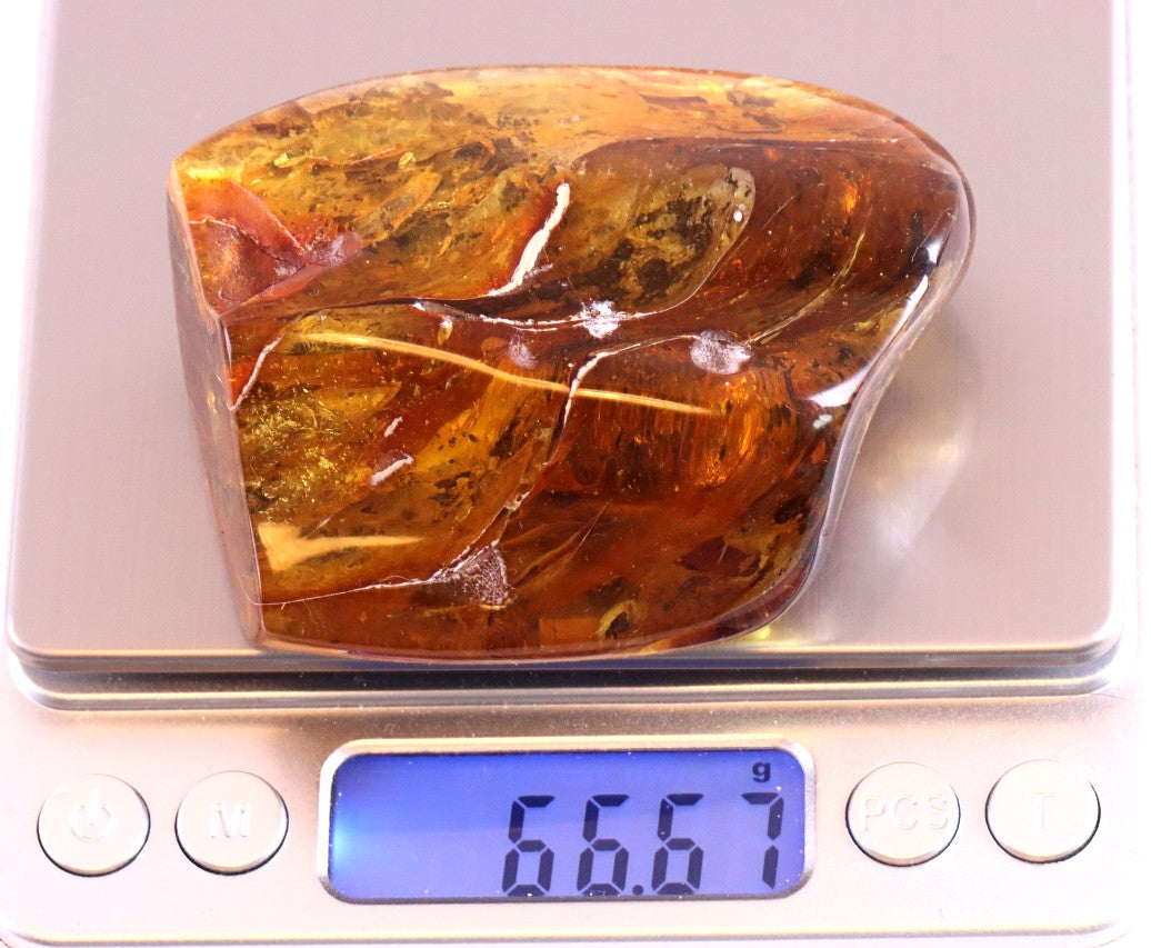 This exceptional Baltic amber specimen weighs 66 grams and is a striking, free-standing piece of fossilized resin. Formed over 40 million years ago, it carries the glow and timeless mystery of ancient forests preserved forever in stone.