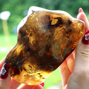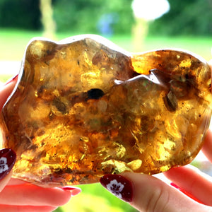 Please note that it is not in the nature of amber stones to be perfect.  They are a gift from nature.  They include lines and spots, specks, colouration and inclusions, included  as the resin flowed from the tree 40 million years ago.  These quirks are to be appreciated as natural phenomena, not seen as faults. Amber is totally unlike mineral crystals in feel and appearance. Warm to the touch.