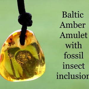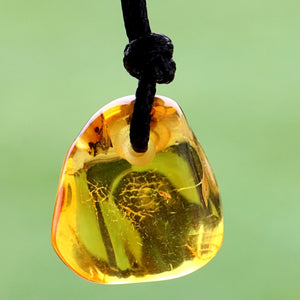 This unique amulet pendant is handcrafted from genuine Baltic amber and contains a tiny prehistoric insect inclusion, preserved for over 40 million years. The warm amber glow and rare fossil detail make this both a wearable piece of ancient history and a symbolic amulet for luck, protection, and grounding energy.