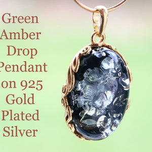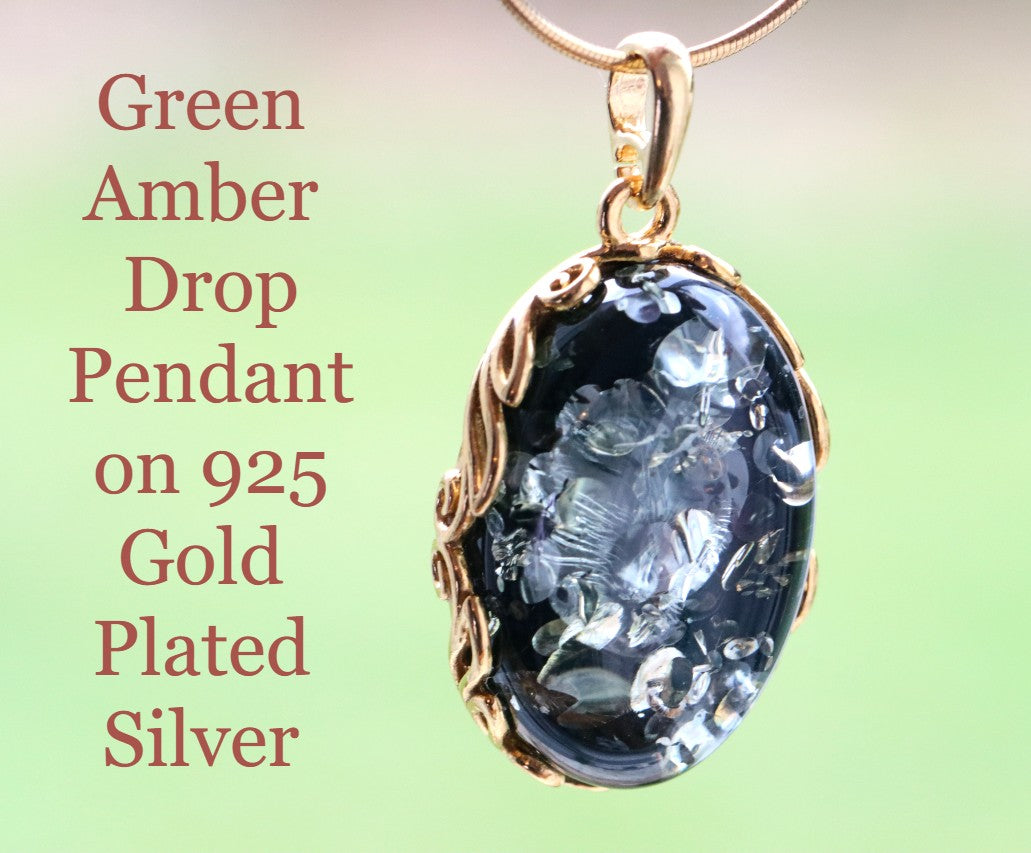 This stunning Green Amber pendant features a sparkling light reflective Baltic Amber gem. The oval setting of gold plated sterling silver is both decorative and complimentary to the gem. A wonderful gemstone jewellery piece to add to the most eclectic natural jewellery collection. Unique and natural, classic and timeless pendant. A perfect gift, packaged in its own eco friendly gift box.