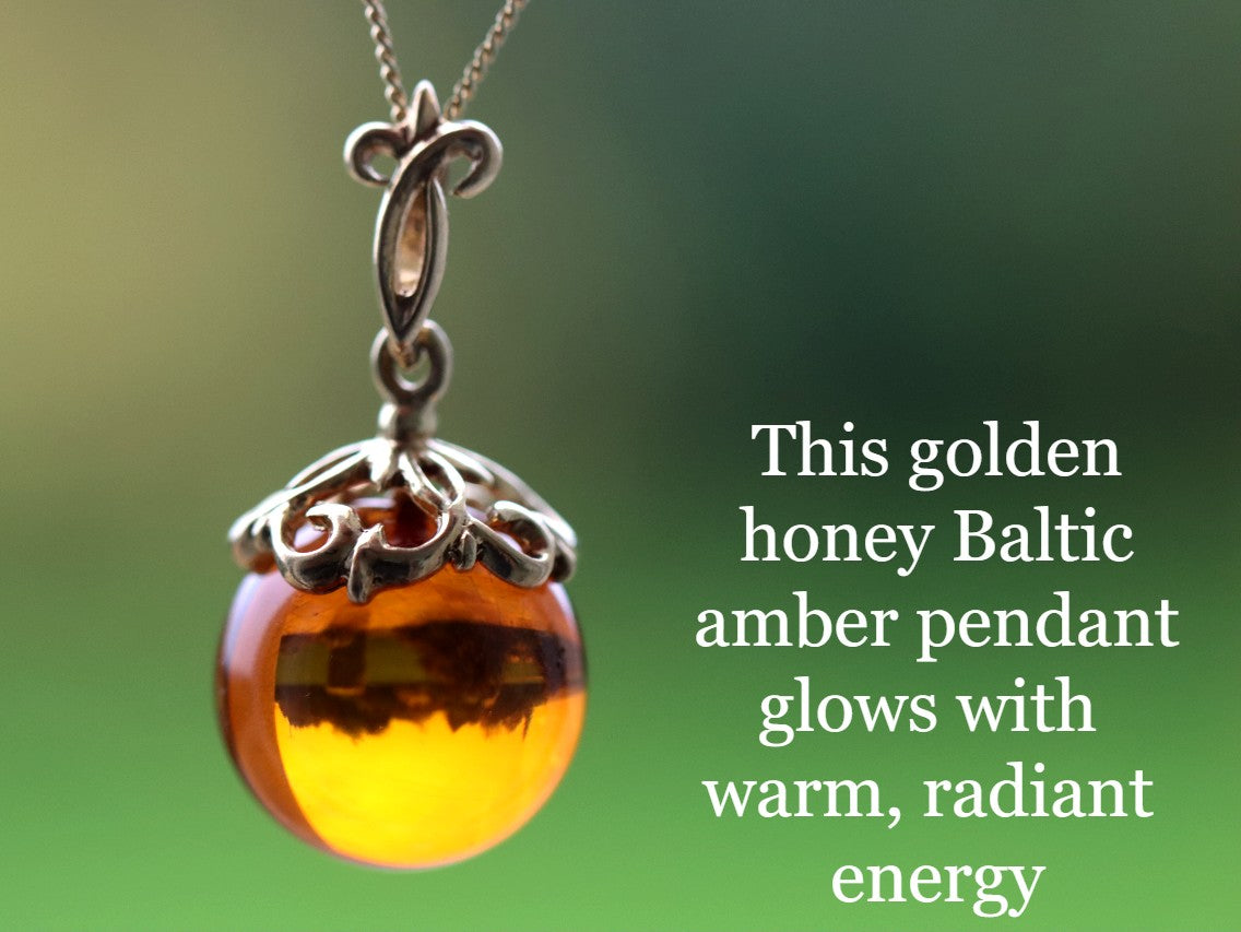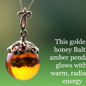 This golden honey Baltic amber pendant glows with warm, radiant energy — a dazzling natural gemstone that reflects light beautifully. Set on a 925 sterling silver bail with rich gold plating, and paired with a matching chain, this piece is a timeless treasure that radiates joy, light, and inner warmth.