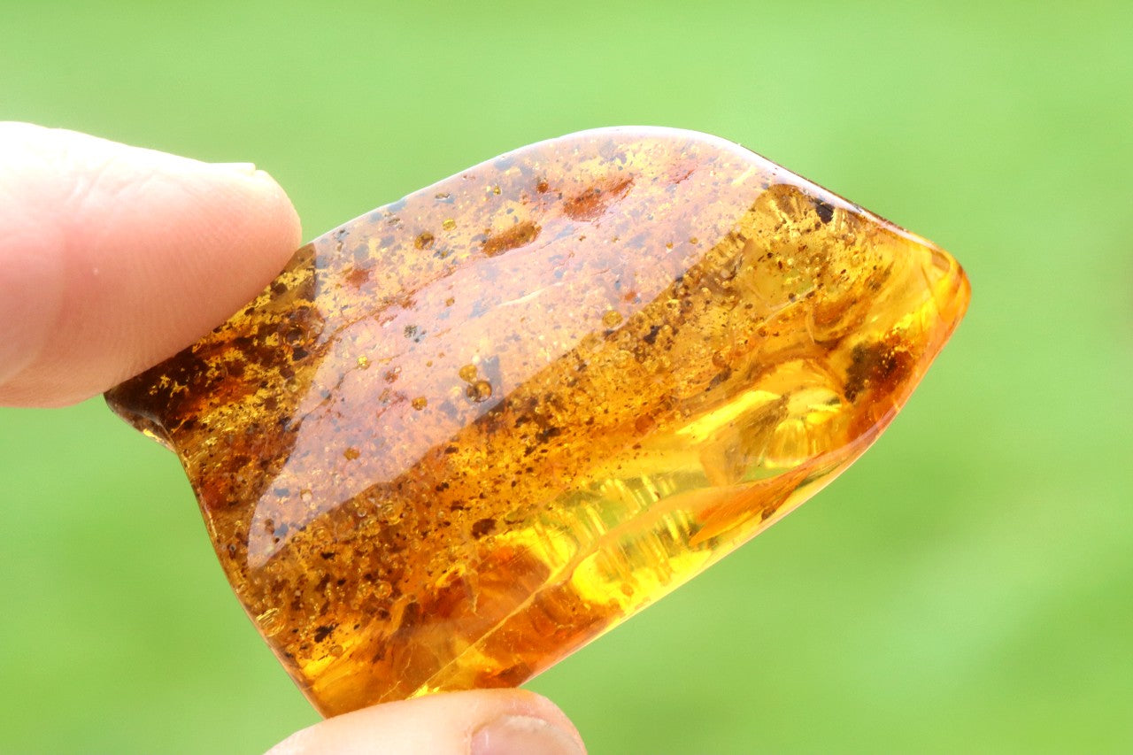 Amber is totally unlike mineral crystals in feel and appearance. Warm to the touch it is tree resin so it is light and warm to hold.
