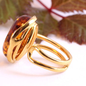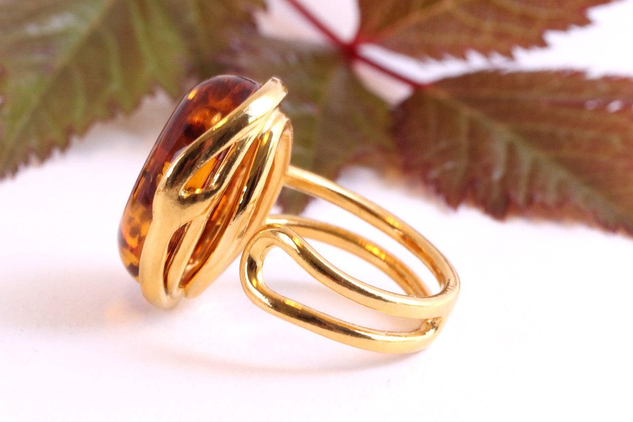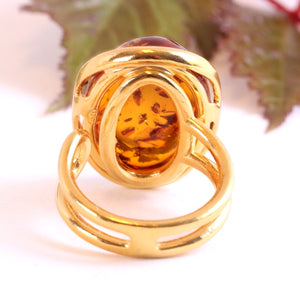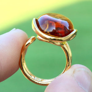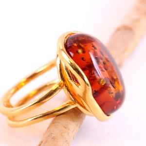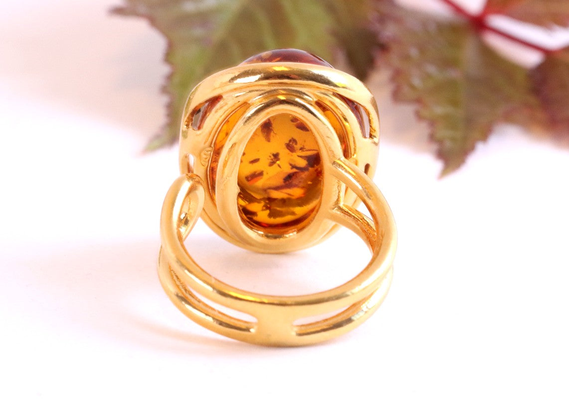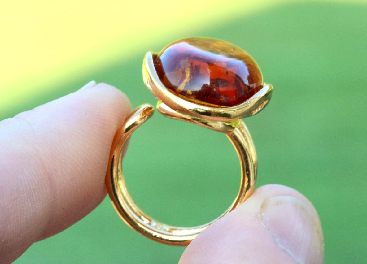 This breath-taking ring features genuine Baltic Amber set in Gold Plated Sterling Silver making it a statement piece. The natural oval-shaped gem is beautifully enclosed and complemented by the 925 Sterling silver finish. This ring demands attention, as it sits high off the finger.  Add a touch of elegance with this stunning ring.