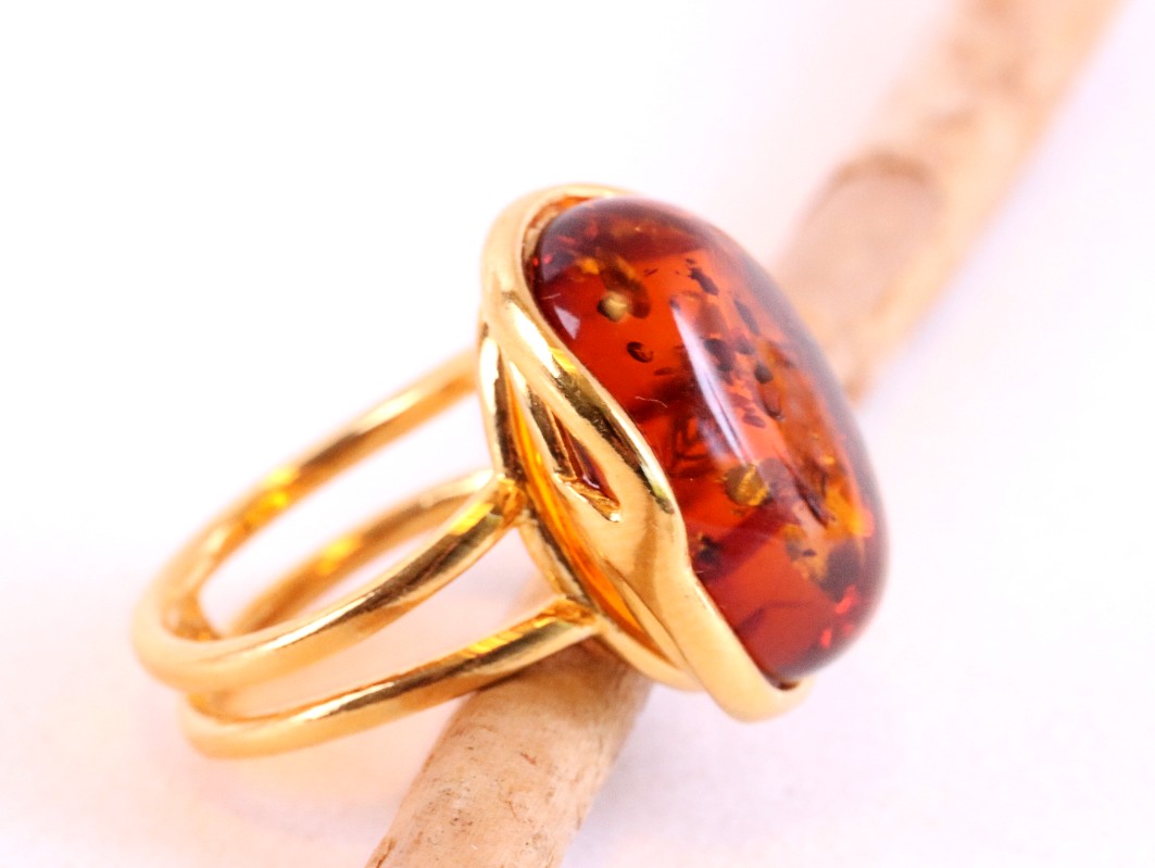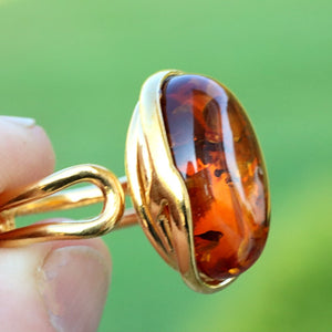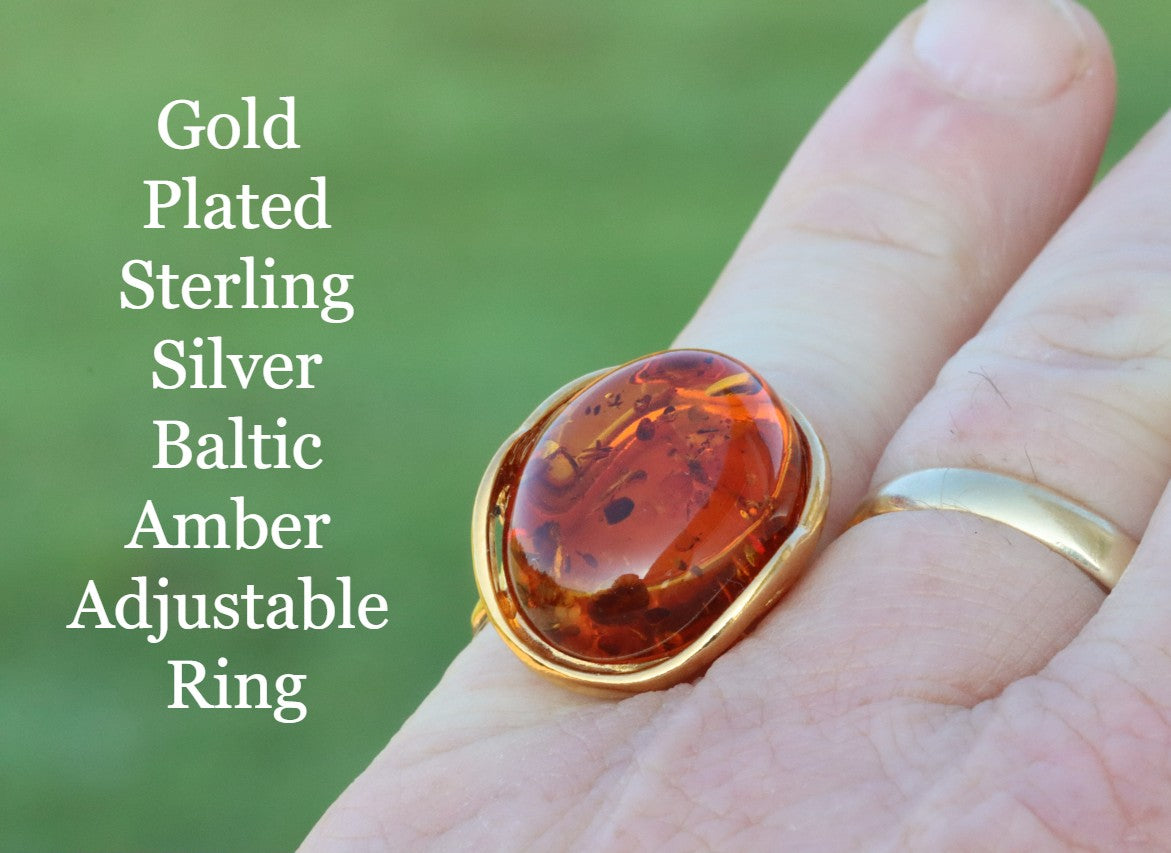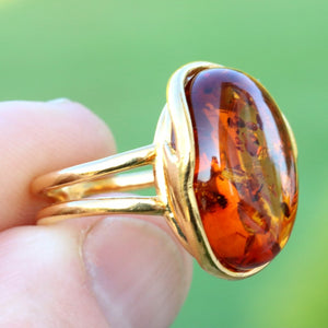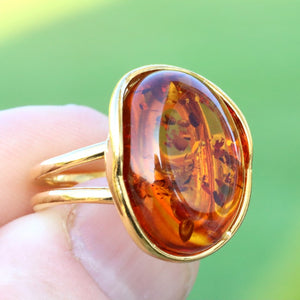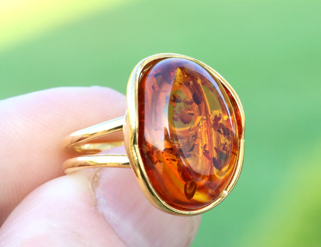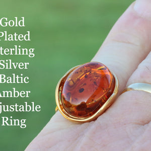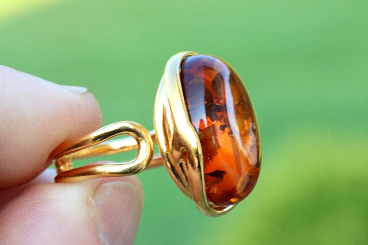 This breath-taking ring features genuine Baltic Amber set in Gold Plated Sterling Silver making it a statement piece. The natural oval-shaped gem is beautifully enclosed and complemented by the 925 Sterling silver finish. This ring demands attention, as it sits high off the finger.  Add a touch of elegance with this stunning ring.