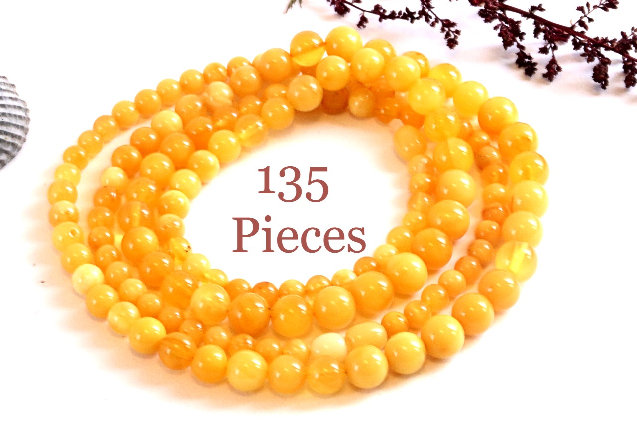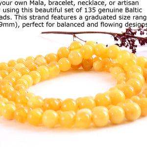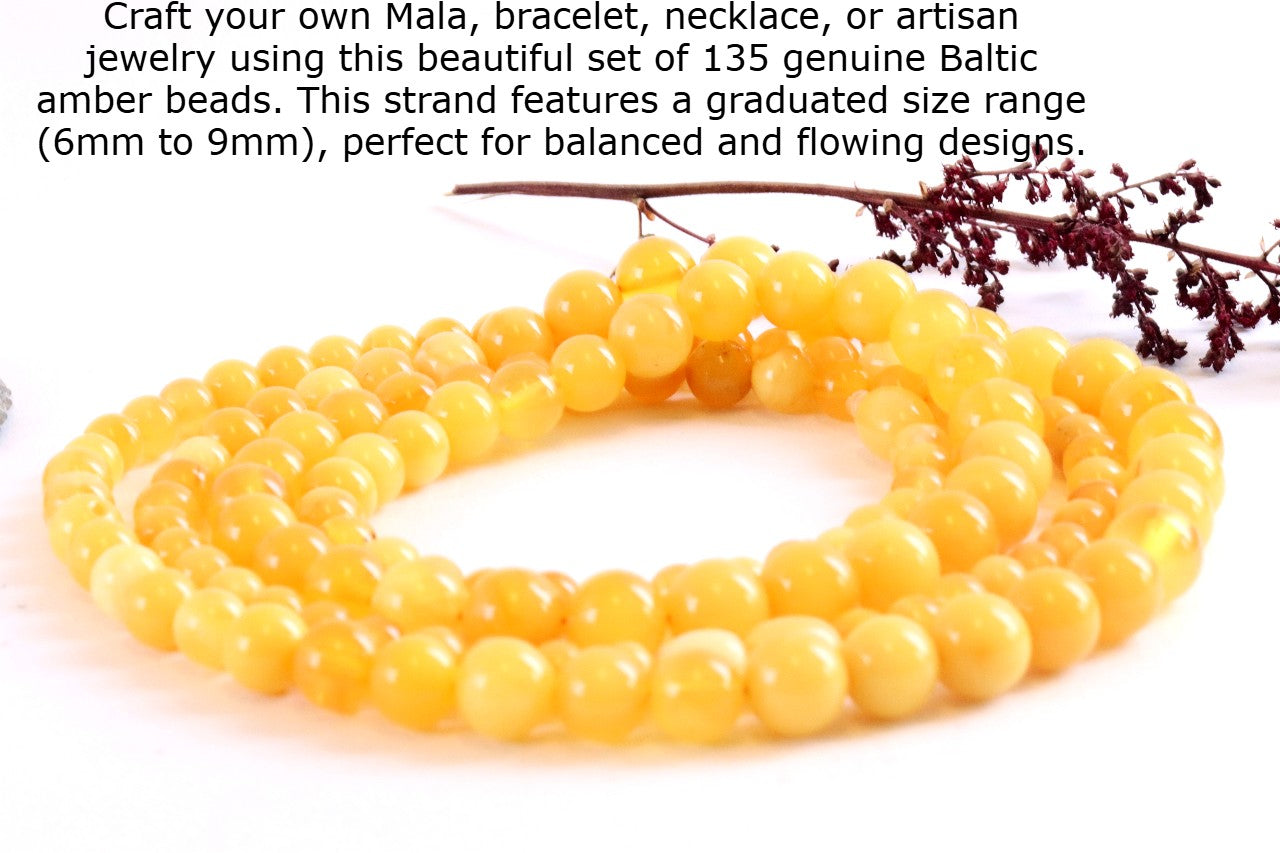 Craft your own Mala, bracelet, necklace, or artisan jewelry using this beautiful set of 135 genuine Baltic amber beads. This strand features a graduated size range (6mm to 9mm), perfect for balanced and flowing designs.