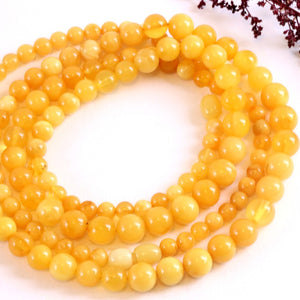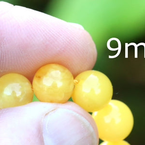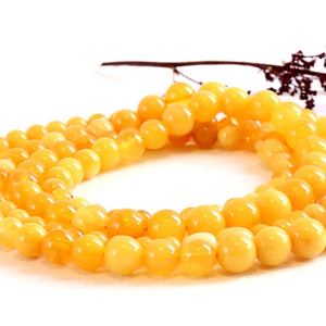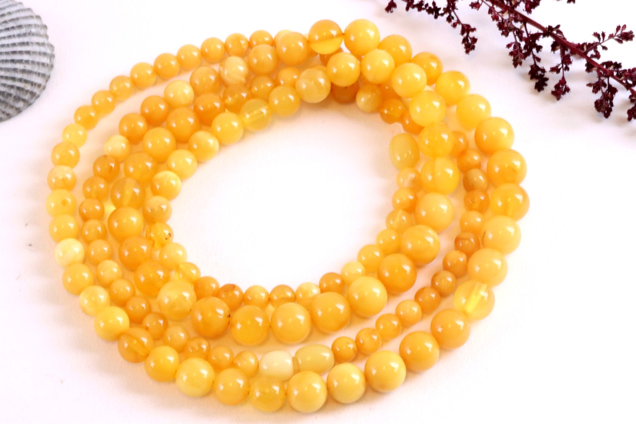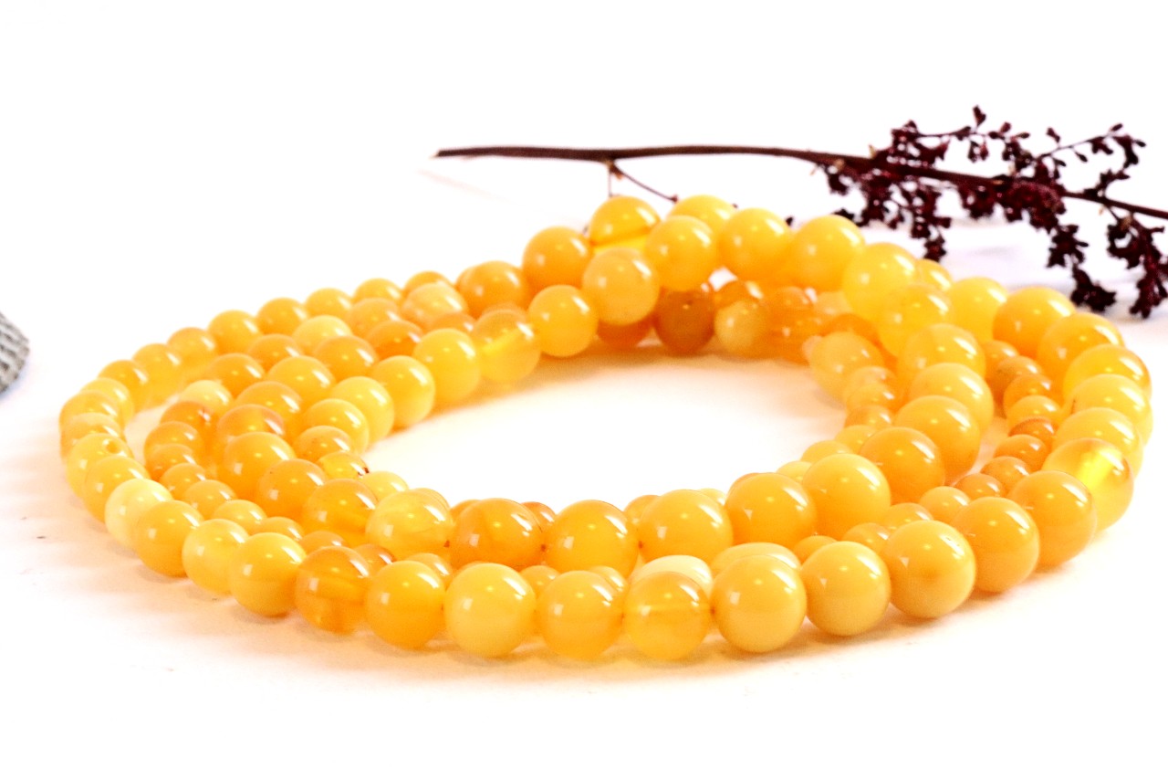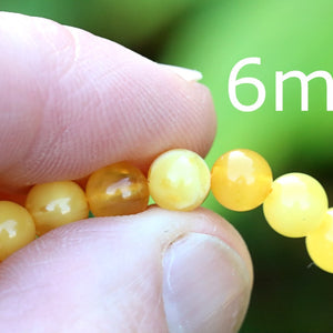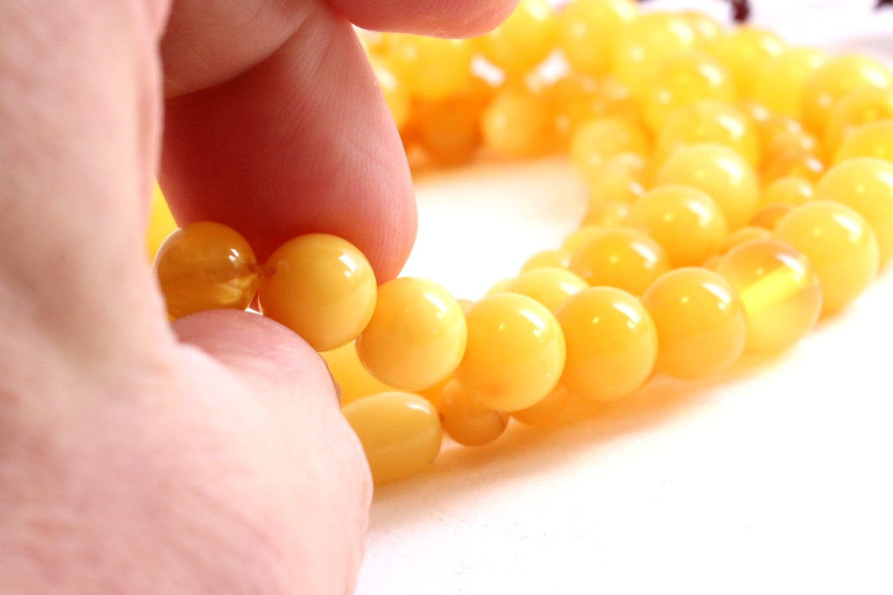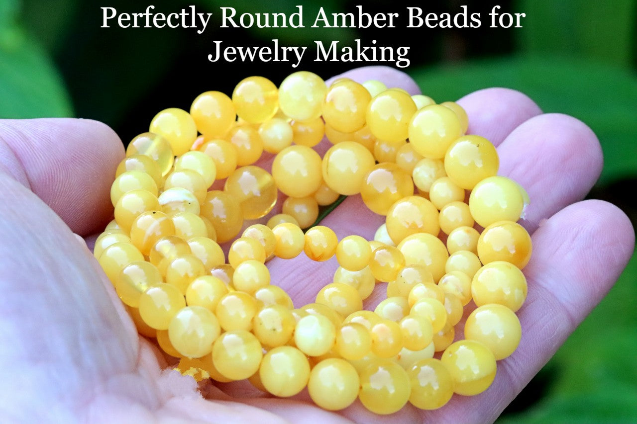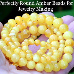 The color palette blends light lemon yellow with milky white amber, offering a warm, sun-kissed natural look. These beads are perfectly round, drilled, and made from eco-conscious, amber—sourced directly from the Baltic region.