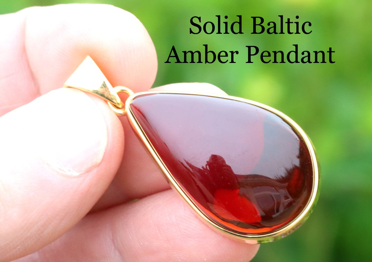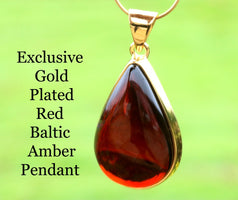 Red Baltic Amber Pendant on 925 Gold Plated Sterling Silver against a blurred green background