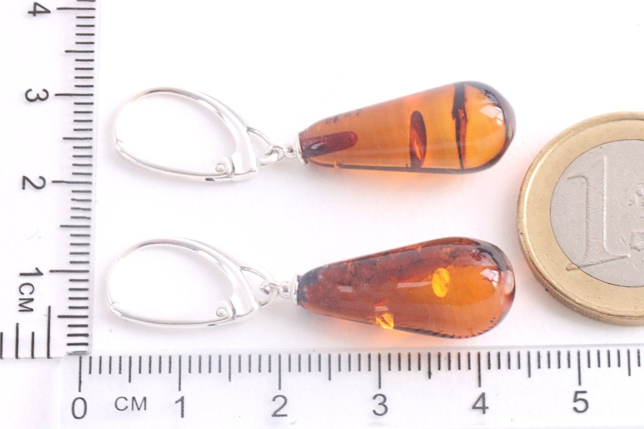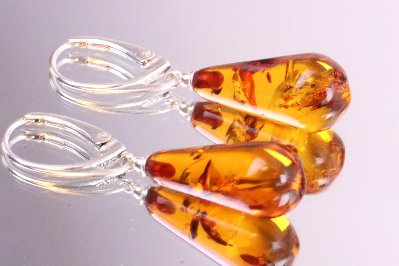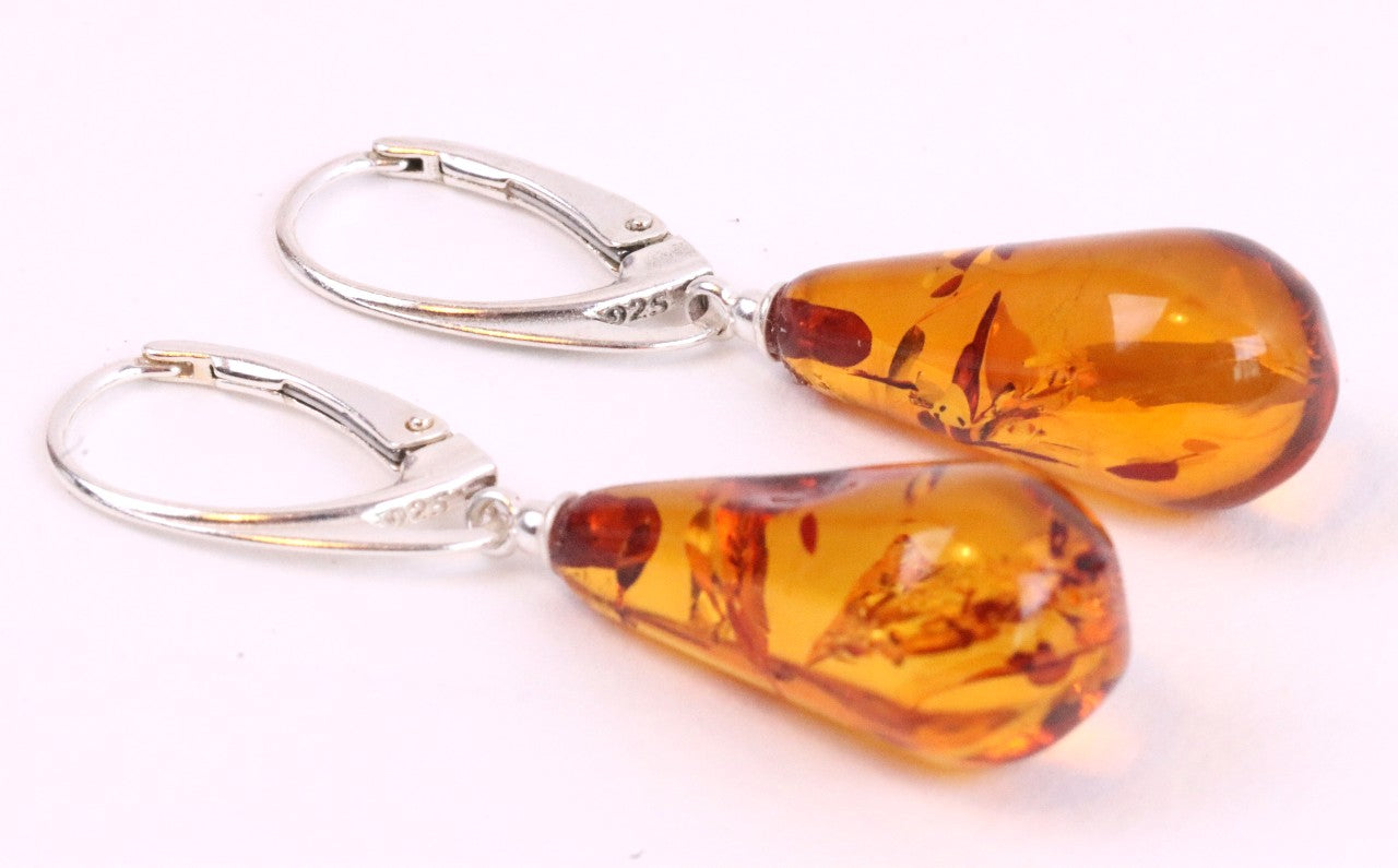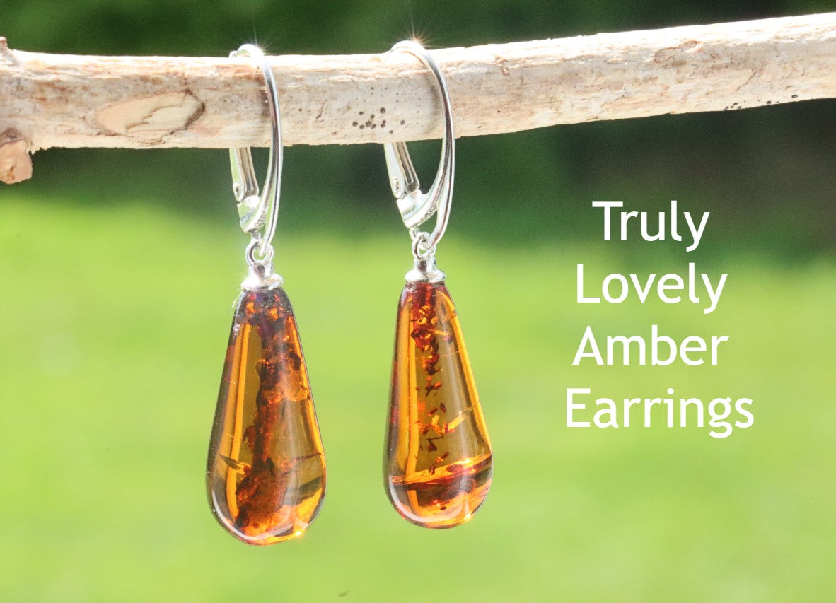 The colour and swing of these earrings make them high impact. Traditional Amber Teardrop Gemstone earrings. Classic and delightful.