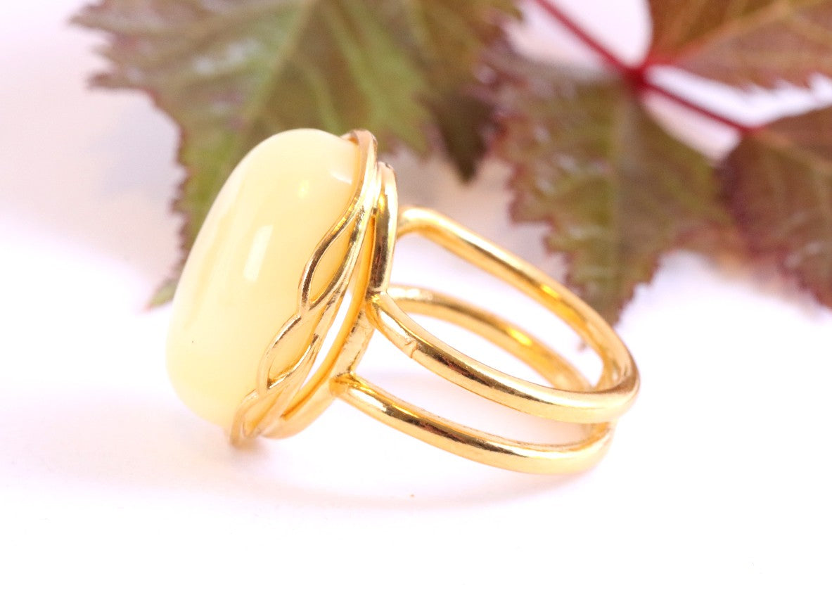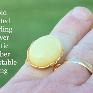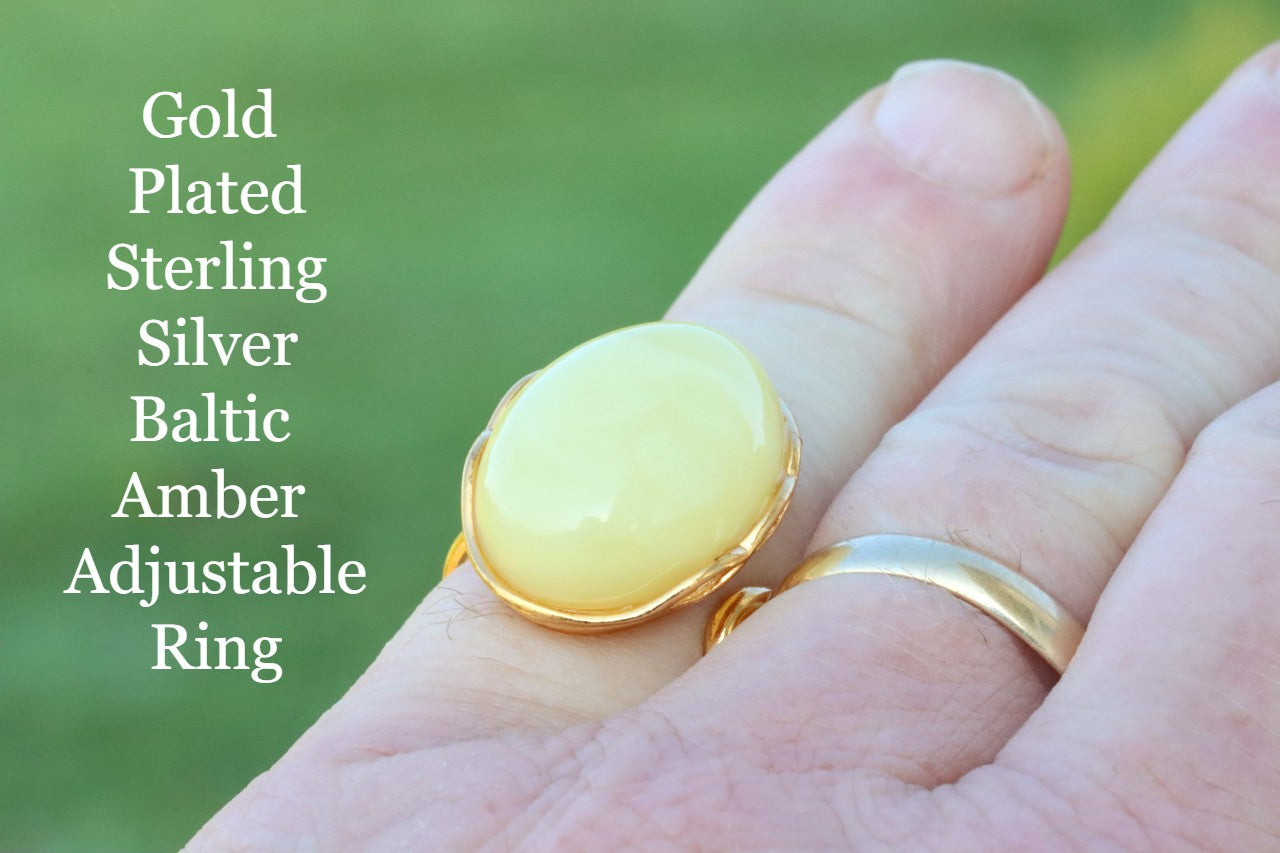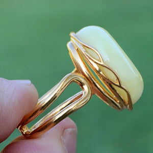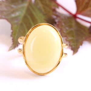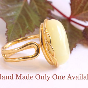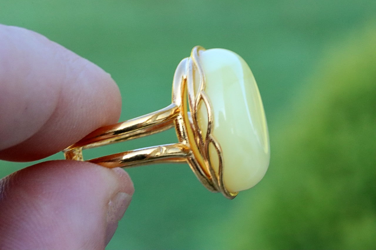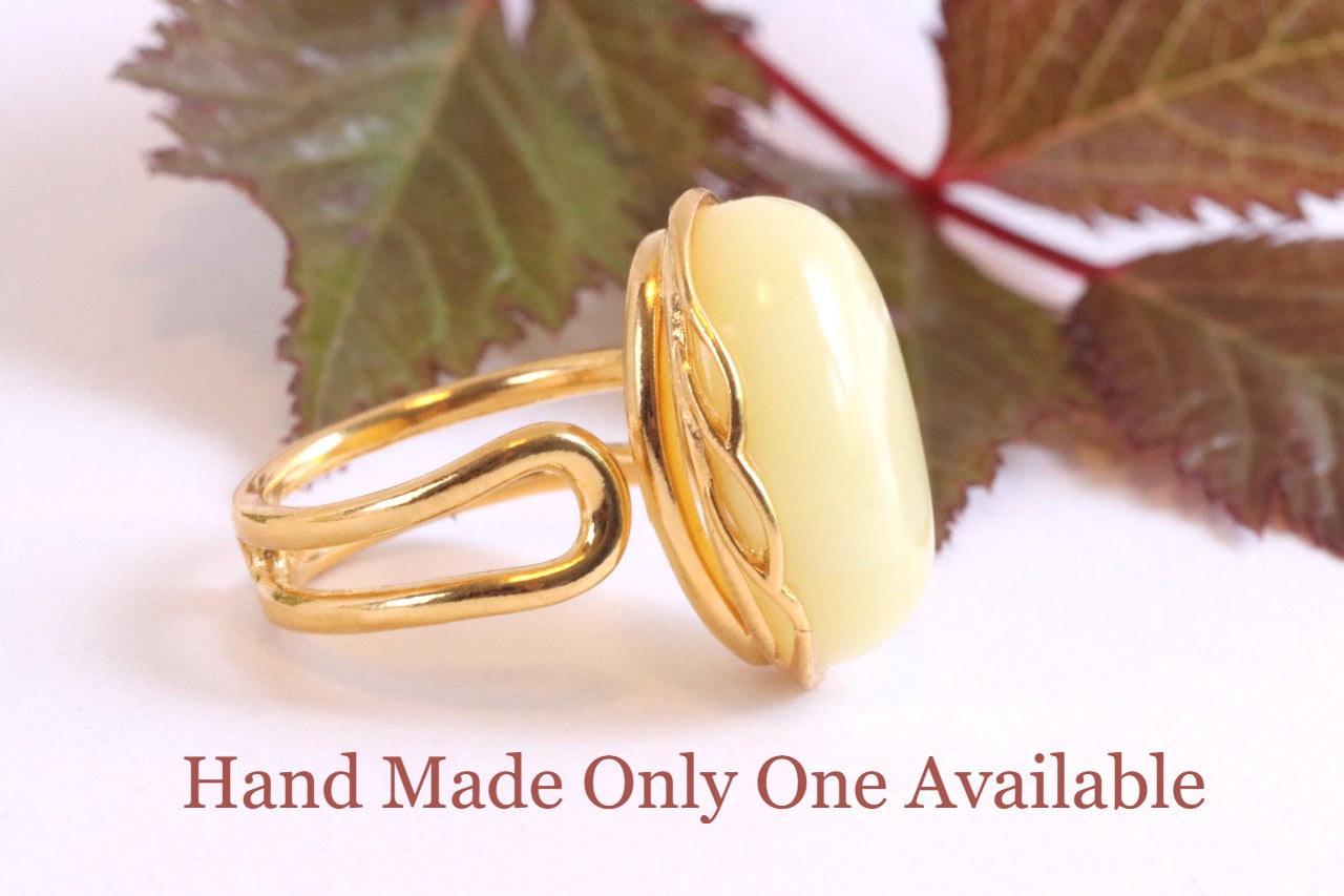 Gold Plated Sterling Silver Baltic Amber Adjustable Ring. White Oval Amber Gemstone Ring / Hand Made Only One Available