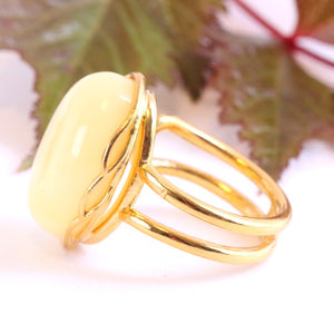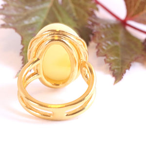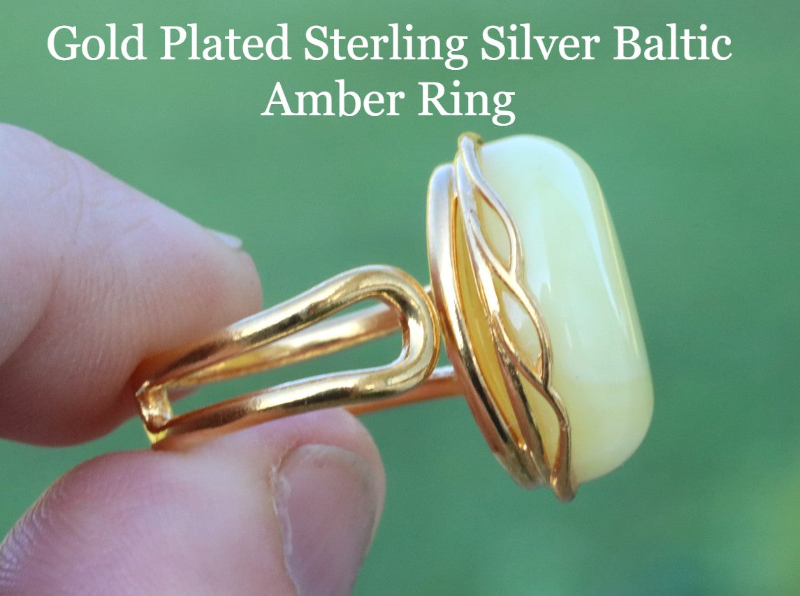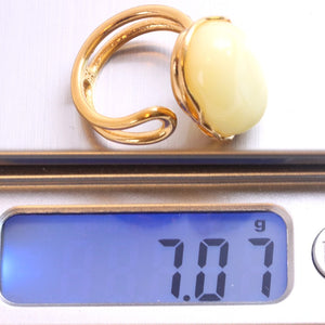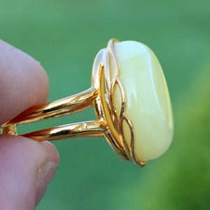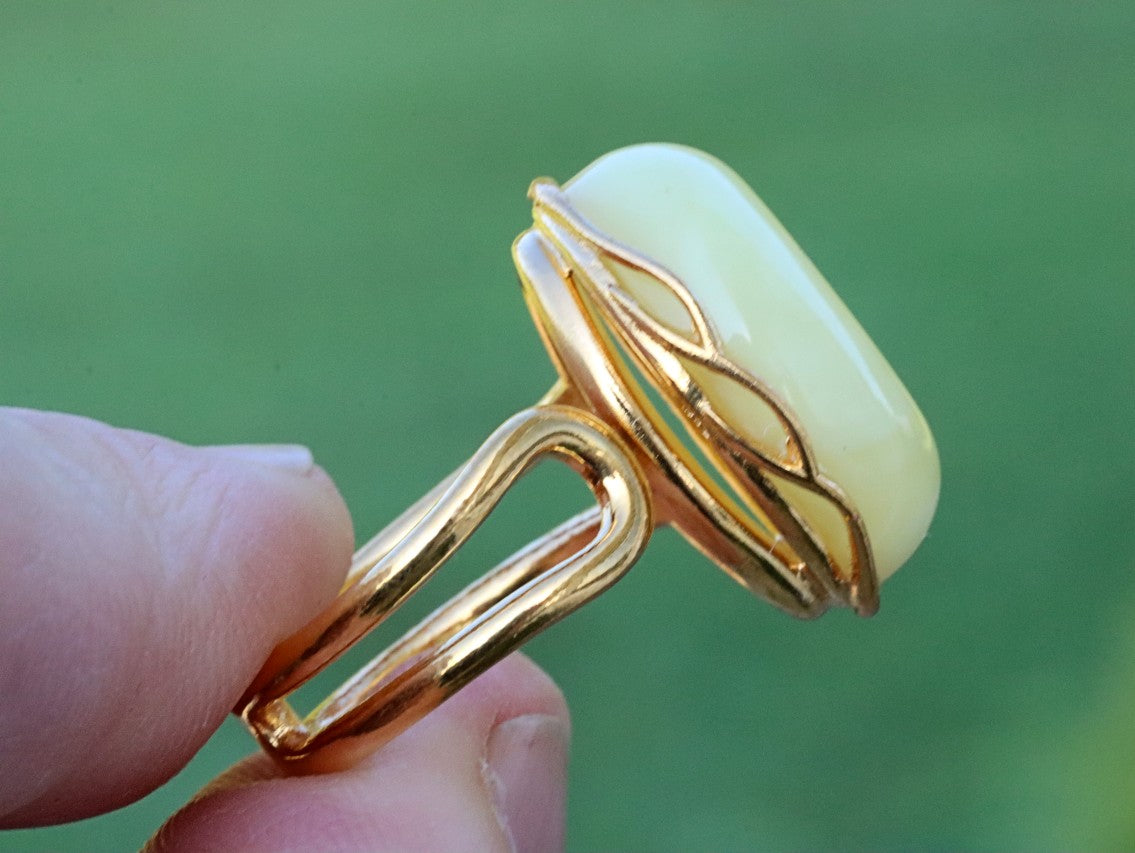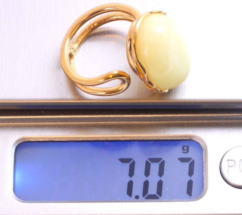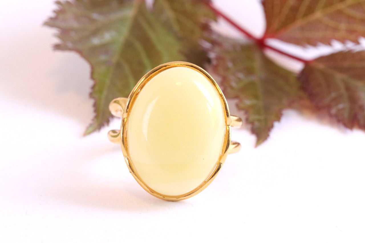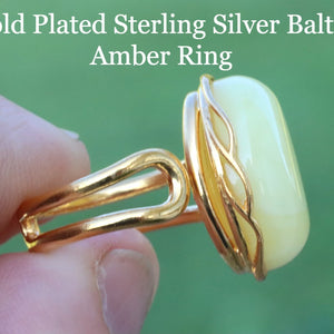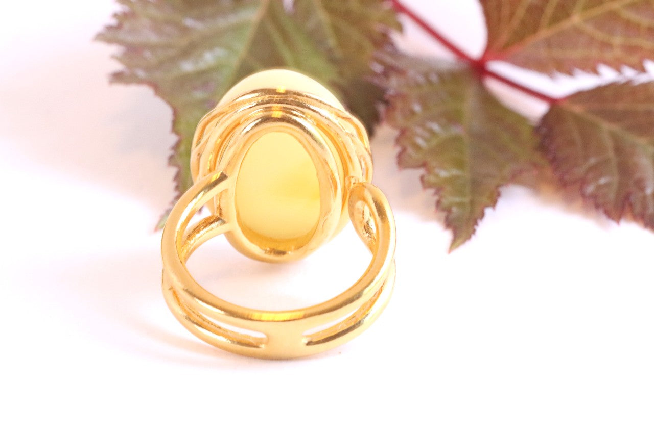 Gold Plated Sterling Silver Baltic Amber Adjustable Ring. White Oval Amber Gemstone Ring / Hand Made Only One Available